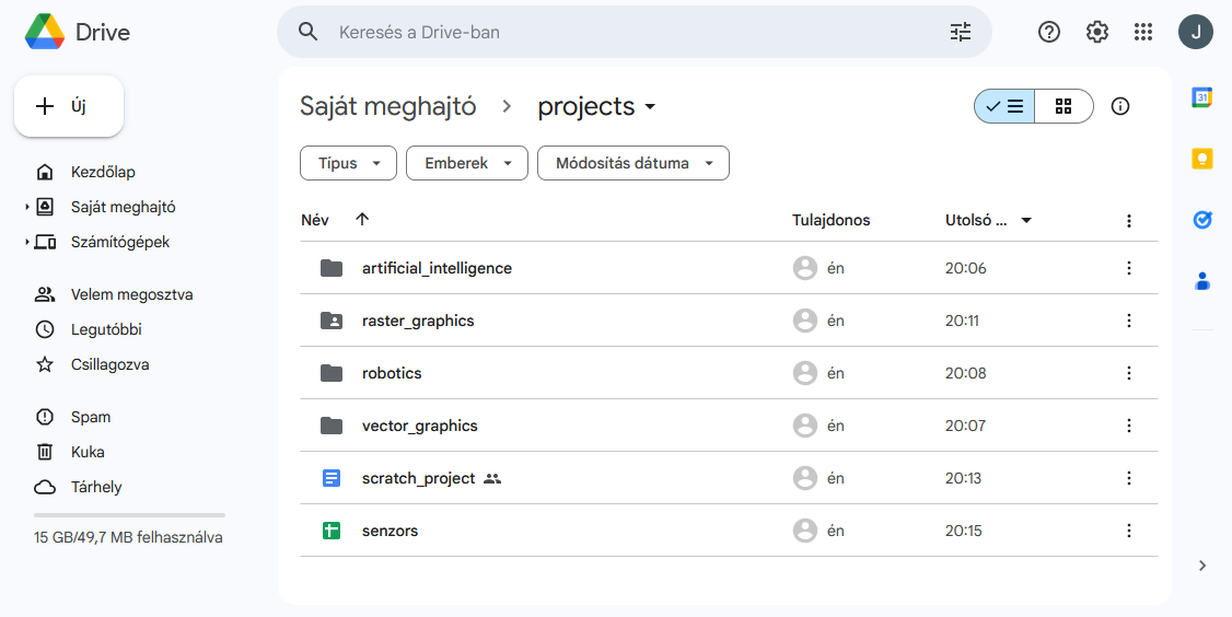 Janka szeret IT-vel dolgozni. Létrehozott egy projektek nevű mappát a Google Drive-on a projektjeihez, amelyekben különböző mappák és fájlok találhatók. A képen a projektmappa teljes tartalmát bemutató képernyőkép látható, a mappa semmi mást nem tartalmaz.